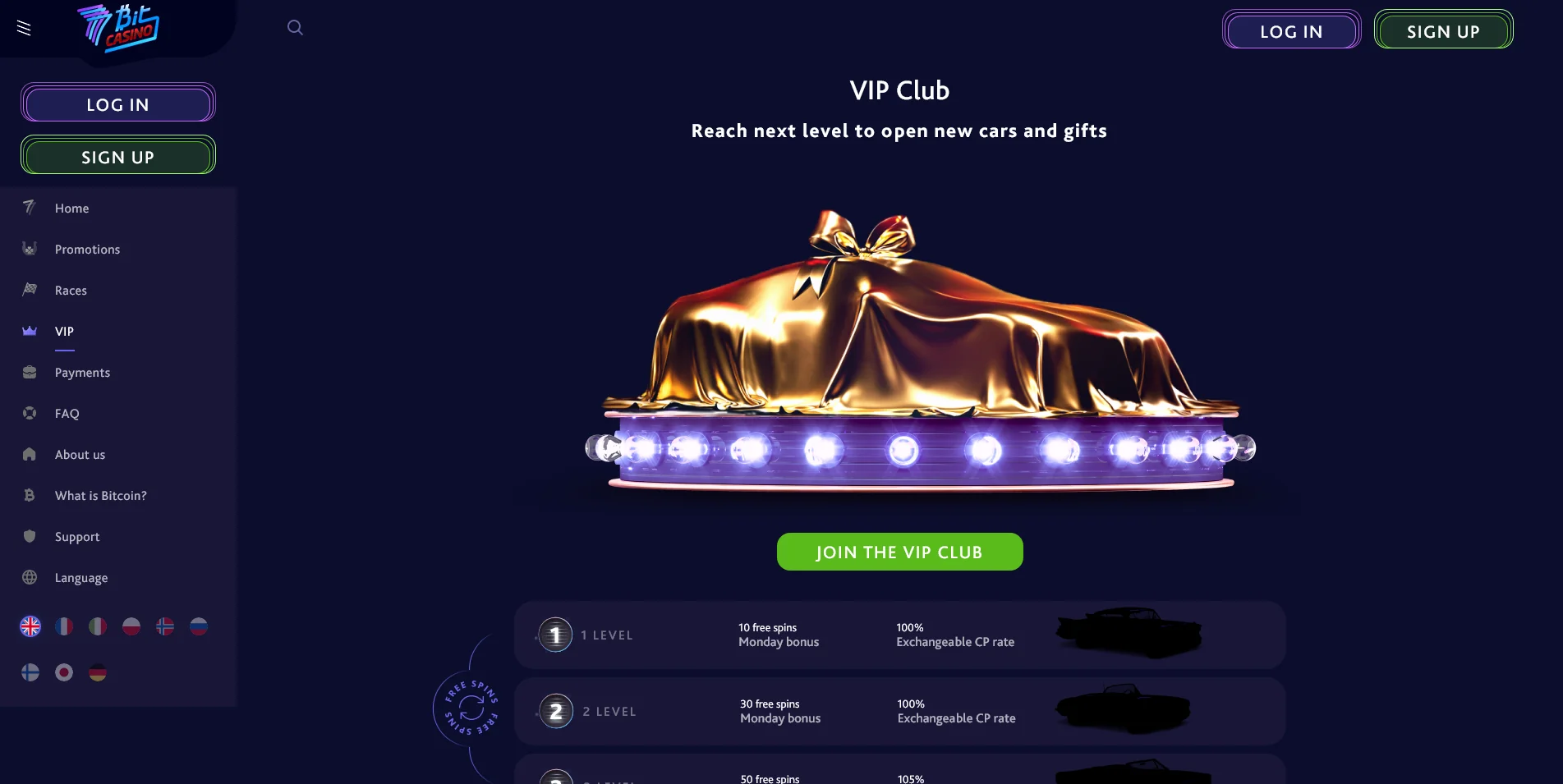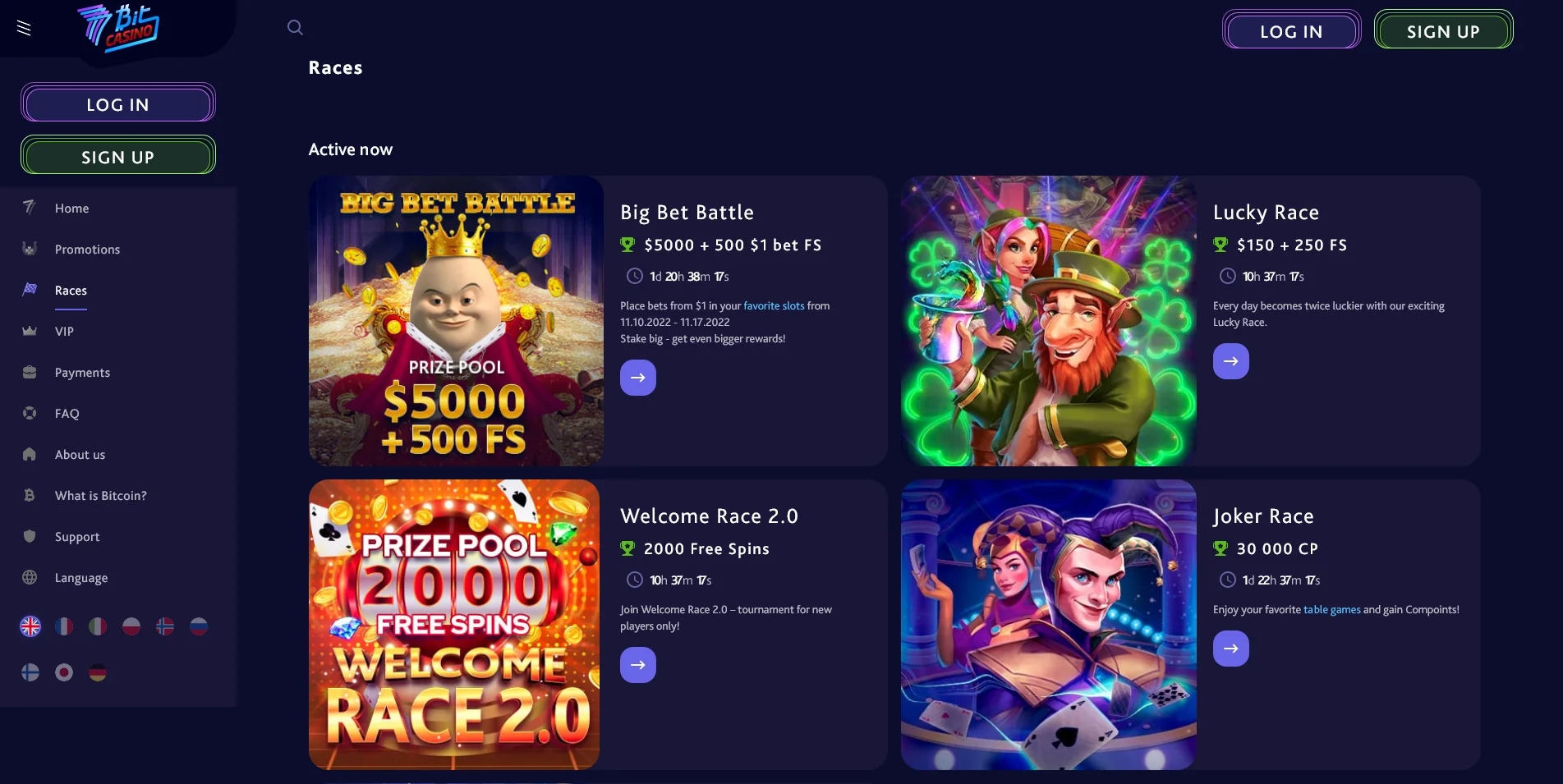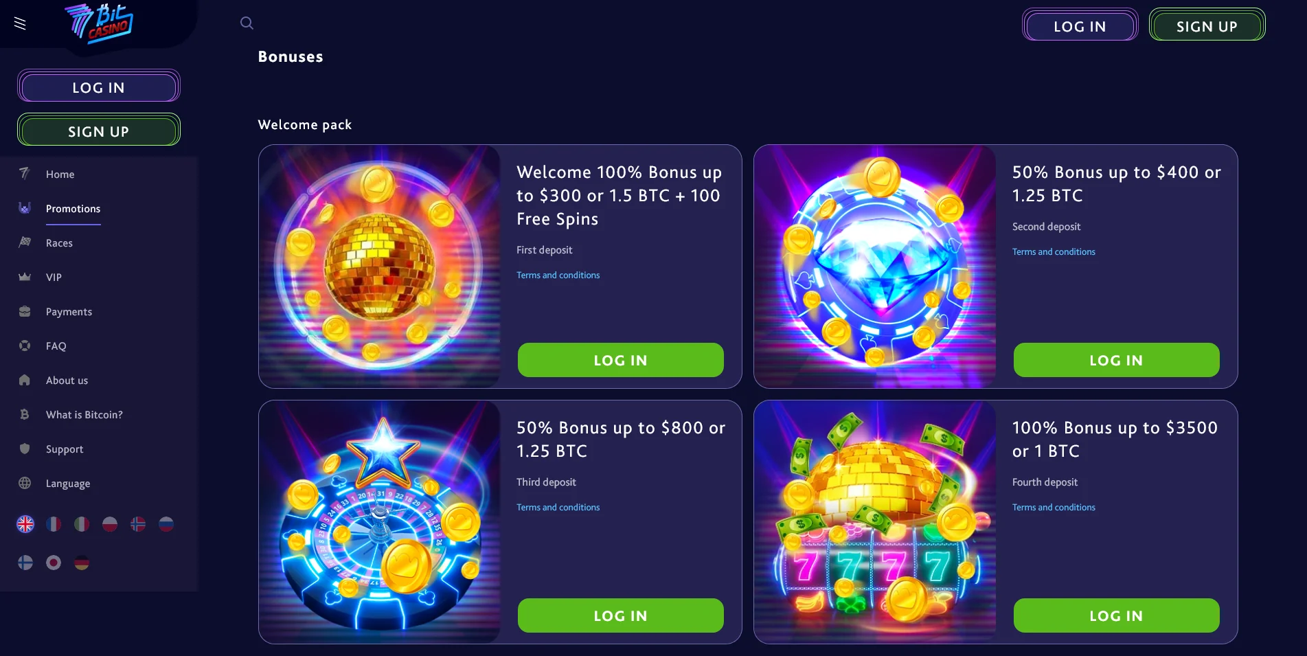 When arriving at 7Bit Casino, we can instantly know, we are about to experience something from the future. The crypto gaming design is crystal clear from the first look. The black and purple colours create the site’s futuristic atmosphere. In the top menu bar, we can see the most important navigation buttons on the left: