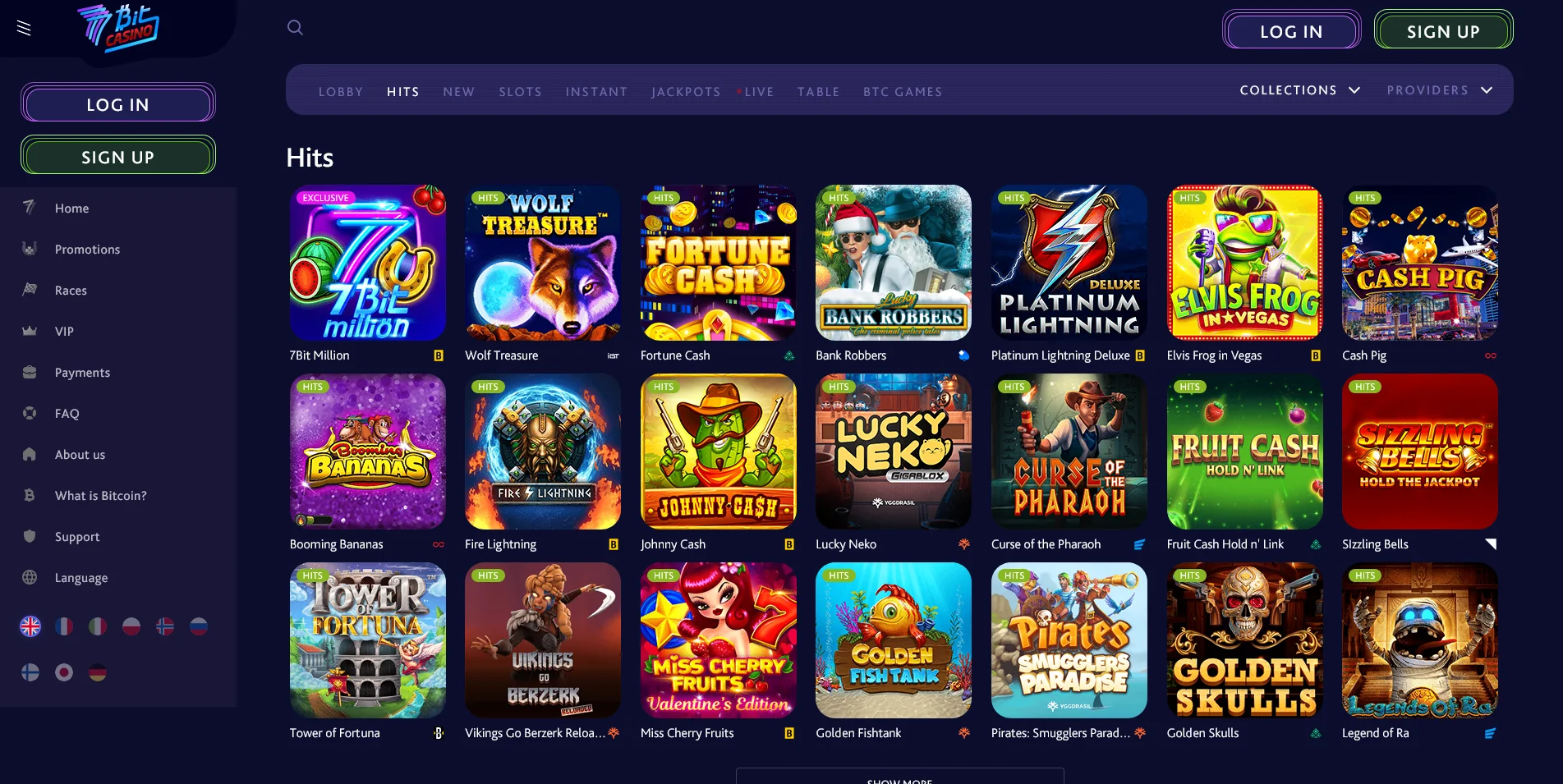Hits, Slots, New, Jackpots, Live, Table, BTC Games