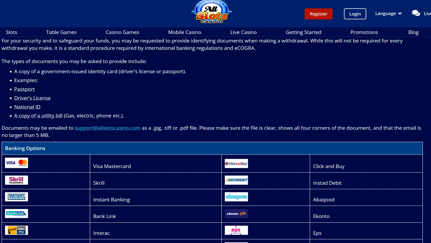 All Slots Casino allows its customers to pick from an abundant catalog of payment systems. You may add and withdraw money using the system you find the most convenient, secure, and fast. Select one of these options to load your account and meet the minimum sum requirement: