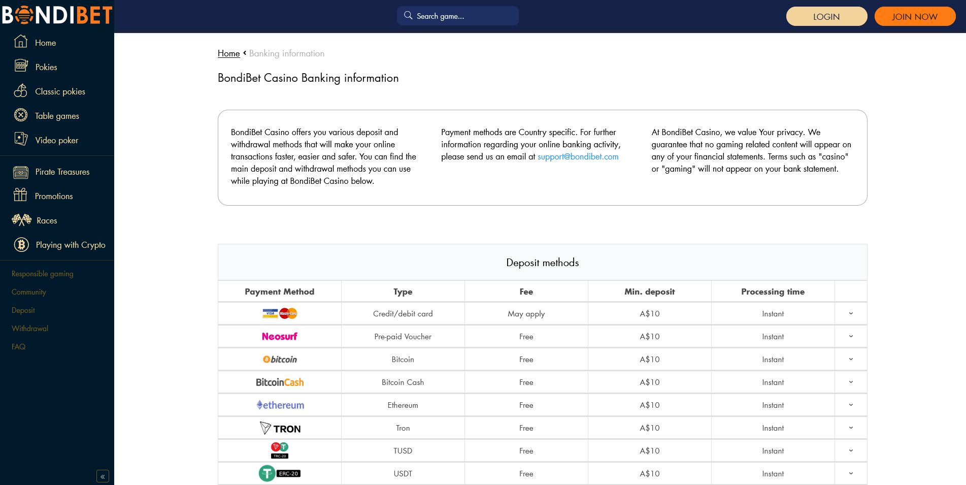 These boxes come with links in them. With their help, you can instantly make a deposit, learn all about Bondi Bet payment methods or check out their available promotions. If you reach the bottom of the site, you will see the following links: