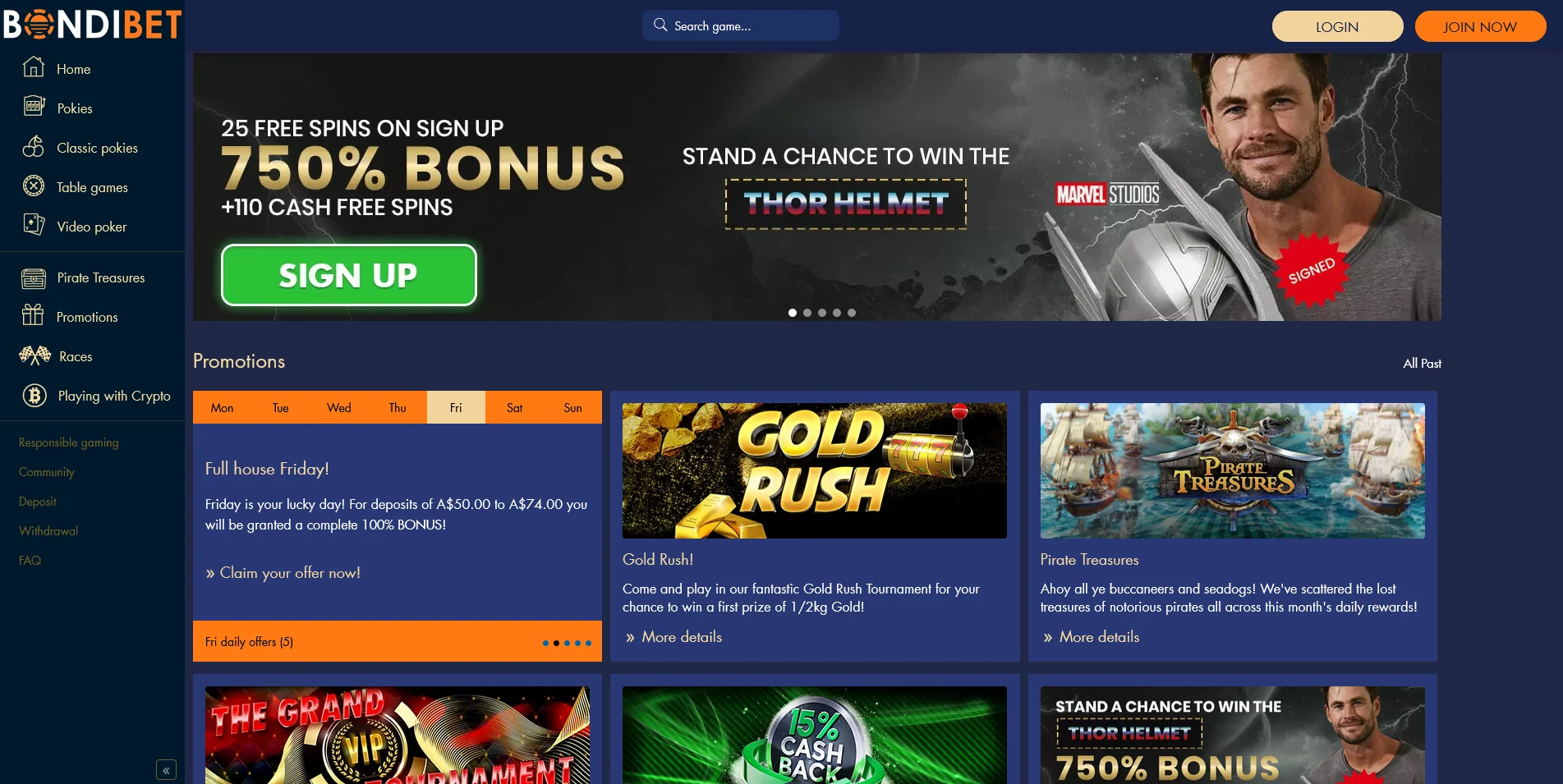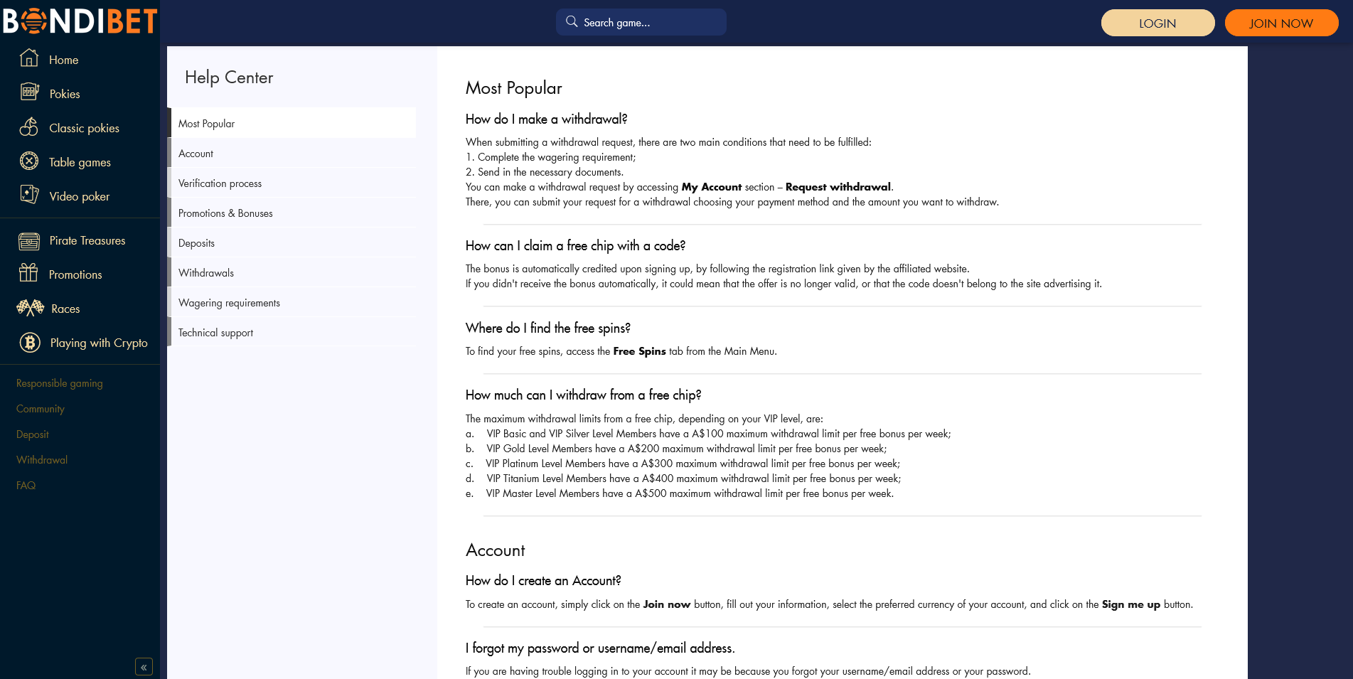 The official BondiBet website has a user-friendly navigation panel. It’s a modern design with simple logic, which is great since it’s easy to understand the concept. In the top menu bar, you can find the following navigation buttons: