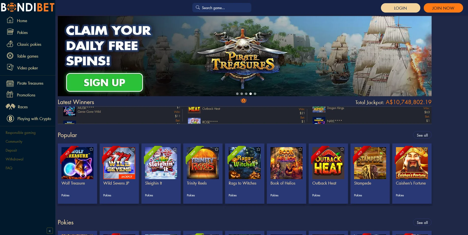 Between the banners and the Latest Winners, hides quite an attractive piece of information: the Total Jackpot amount, which is waiting for BondiBet players to win. Keep scrolling lower to see the gaming content of the site. You can check all kinds of casino games while browsing through the website. Below the gaming content, you will see some useful links: