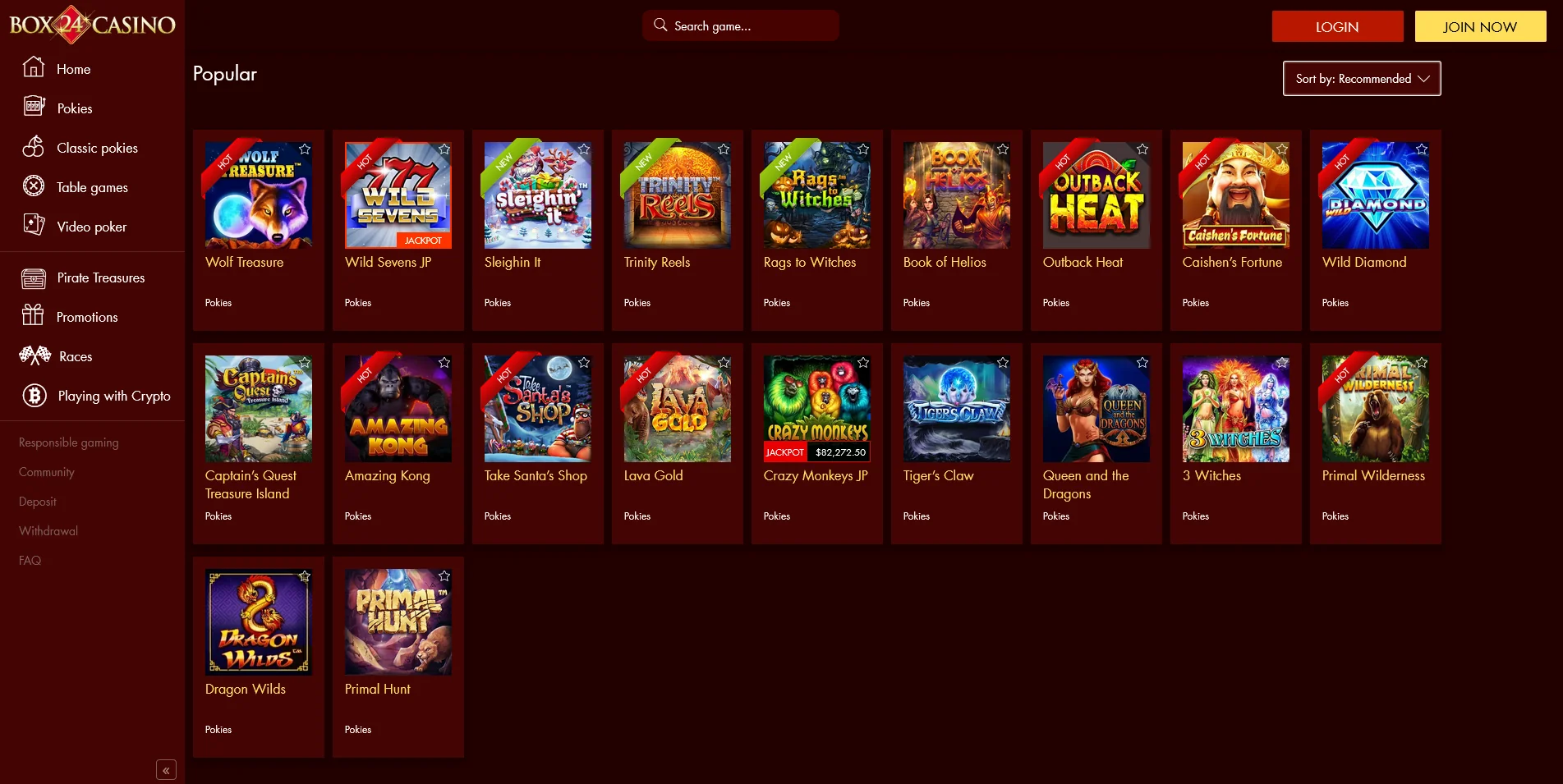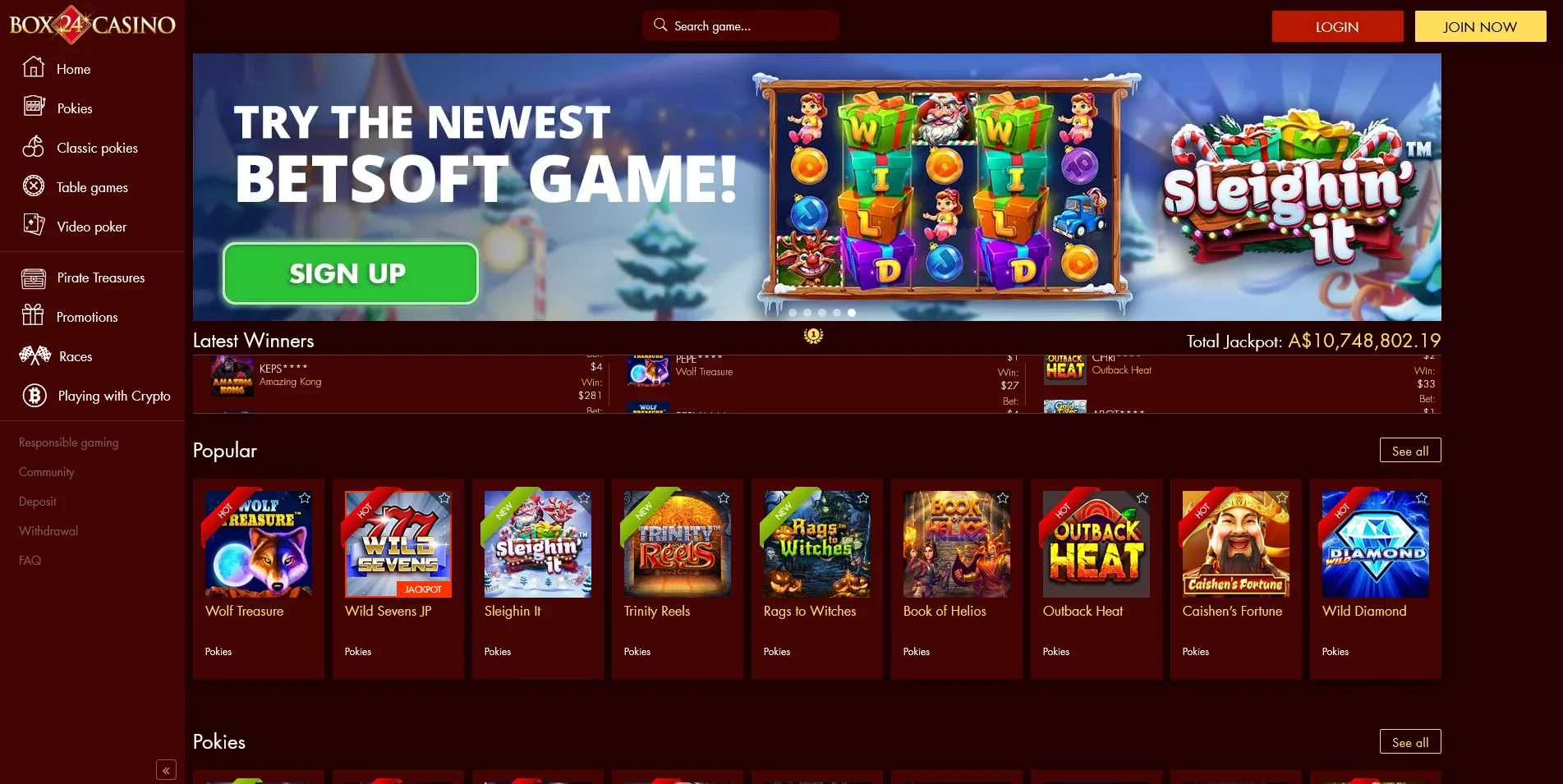 First, you can see the Total Jackpot amount that is waiting for all Box 24 players to win. Another one is about the latest winners at the site. It’s a constantly updated list of the luckiest players on the site, who just won a nice some of the money. Scroll lower to access the full gaming content of the website, starting with the most popular pokies.