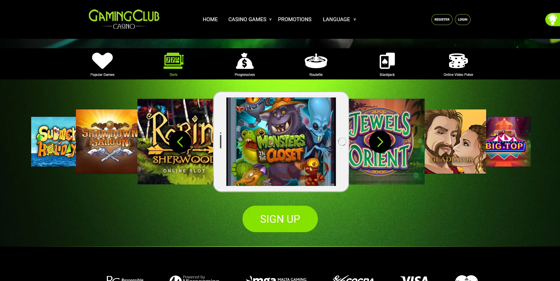 The Gaming Club casino site is designed in black and green colors, with the club logo in the upper left corner. On the same line with the logo is the account login button. There you will also find a drop-down menu that contains the following items: