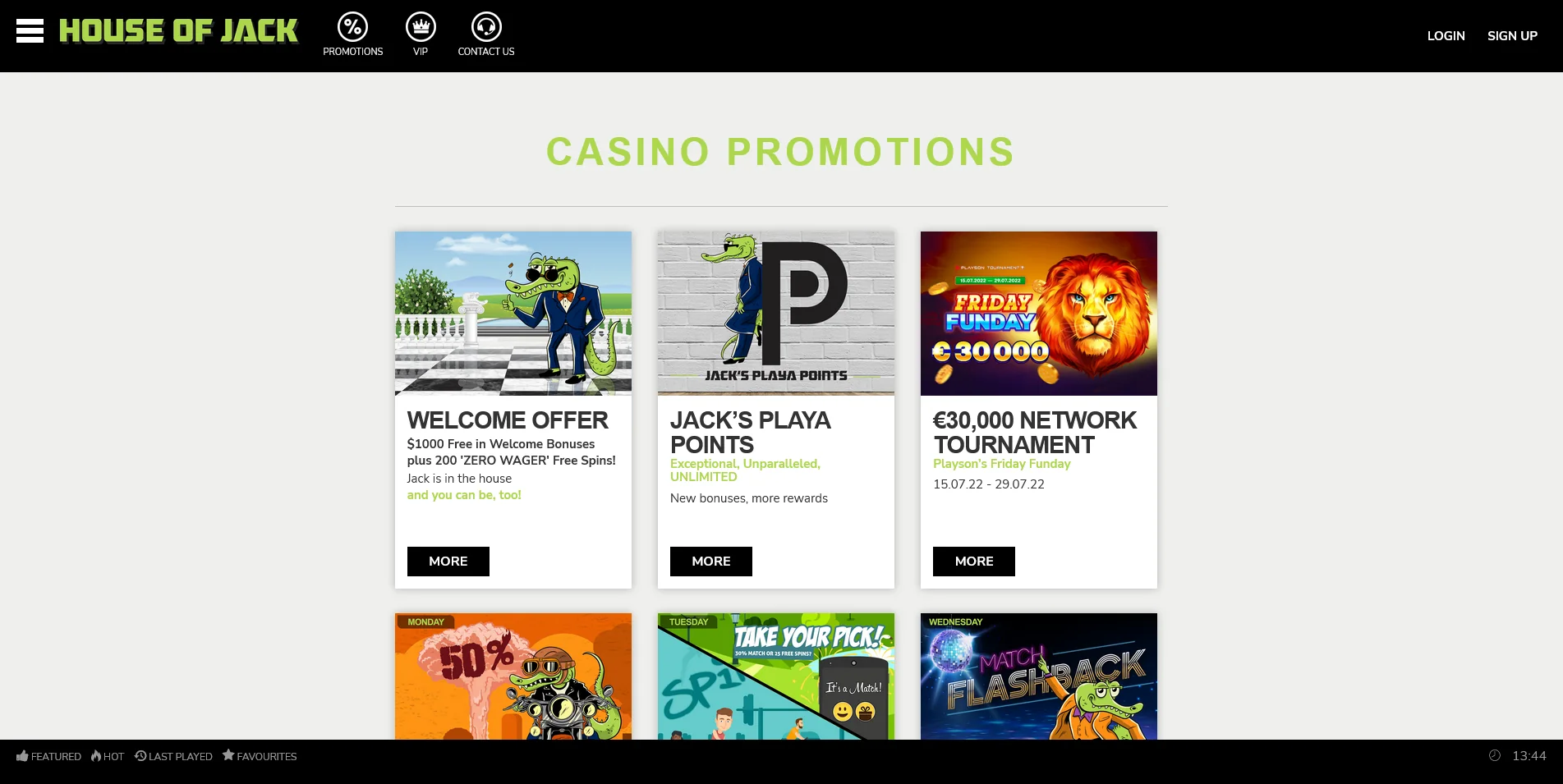 House of Jack Australia created conditions for every new Aussie player to receive an additional reward for the first few transfers of funds to the portal. There are also permanent promo and promo codes for active users. This set of constant promotions create conditions on the site when you can additionally play pokies for free and receive additional rewards.