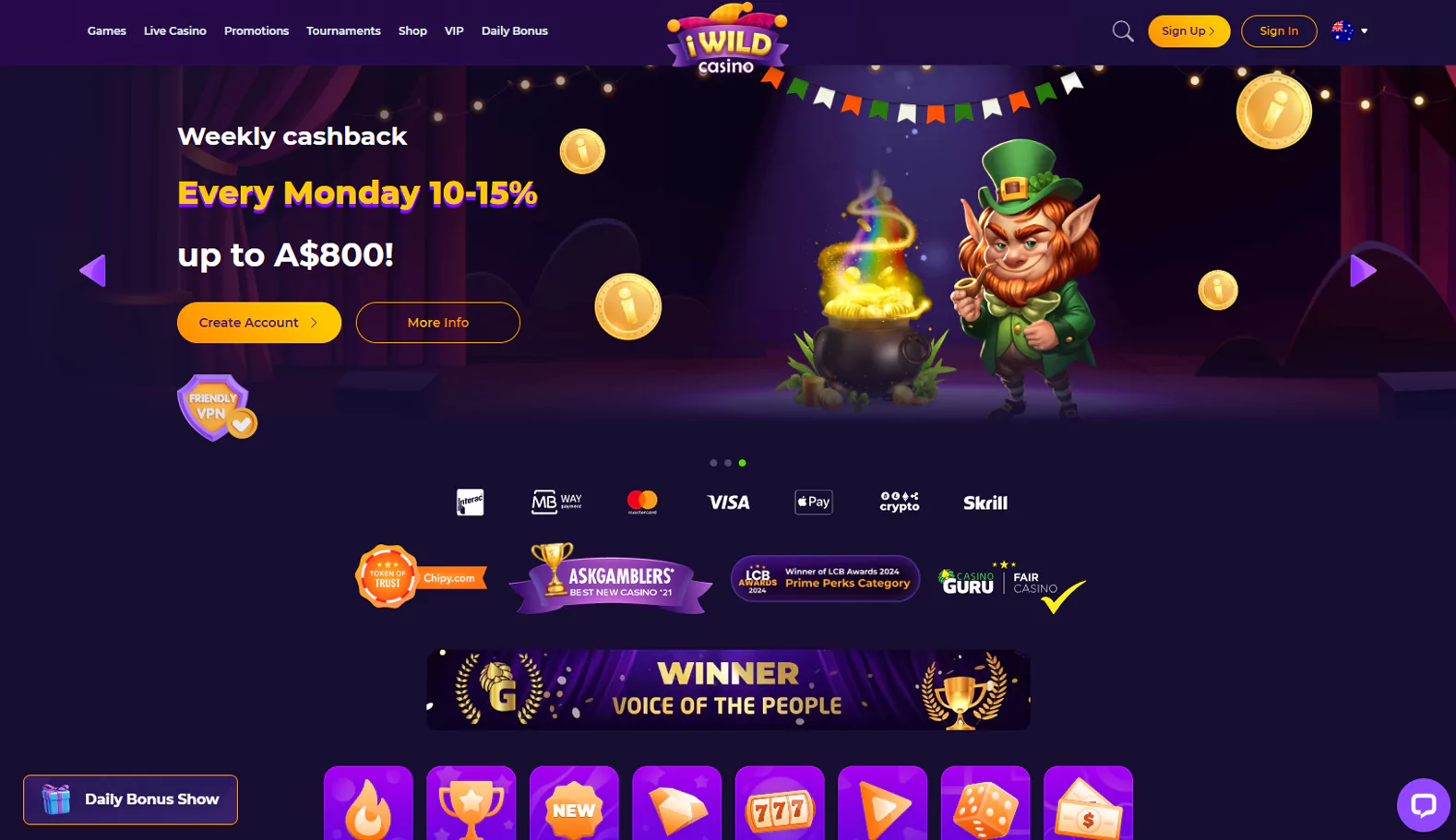 | Wednesday Bonus | Enjoy a 50% bonus up to A$1600 + iWild casino 50 Free Spins on your first deposit every Wednesday. Spins available on Gates of Olympus (Pragmatic Play). |