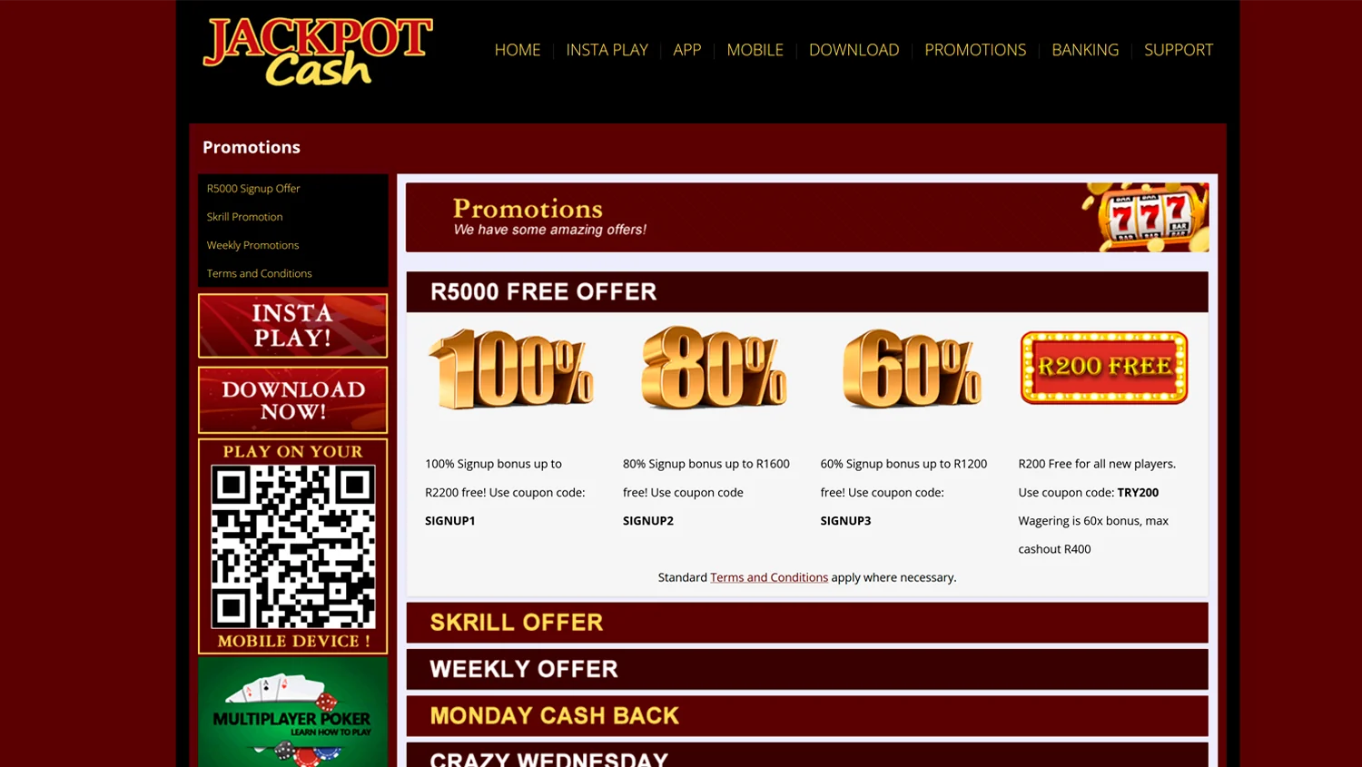 The mobile site has the advantage of accessibility, while the app needs to be downloaded and may not work on some old phones. But the app will be better optimized and have faster downloads or even offline play. Jackpot Cash gives you the best of both.