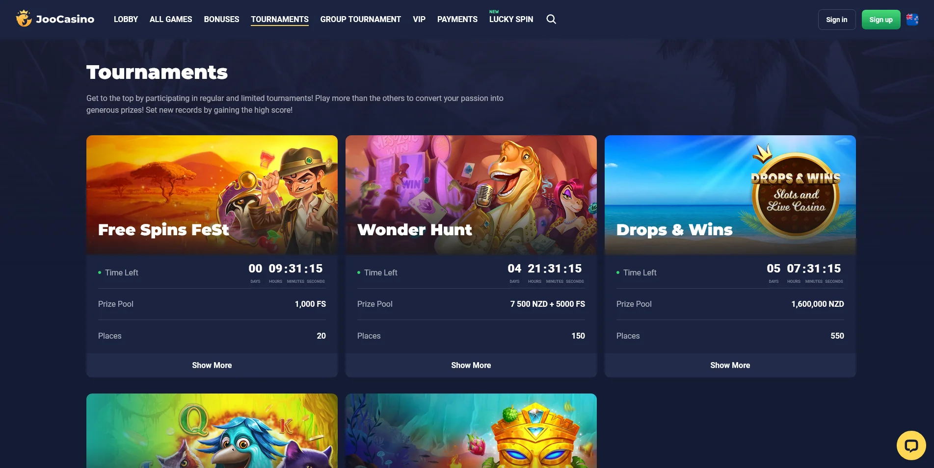 Right next to them, in the upper right corner, there is the black Sign In button, the green ‘Sign Up’ button, and the button that lets you change the language of the Joo Casino site.