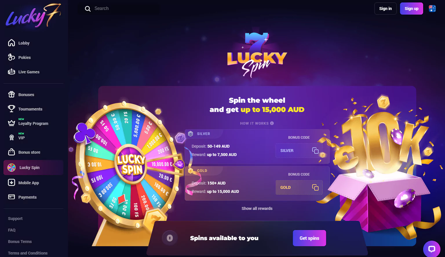 Aussies who play online are always looking for bonuses, so we looked closely at the Promotions section and found that Lucky7 Casino has many ongoing promotions. New players can claim the remarkable welcome package, while there are reload promotions for current players as well as a Lucky Spins exclusive offer.