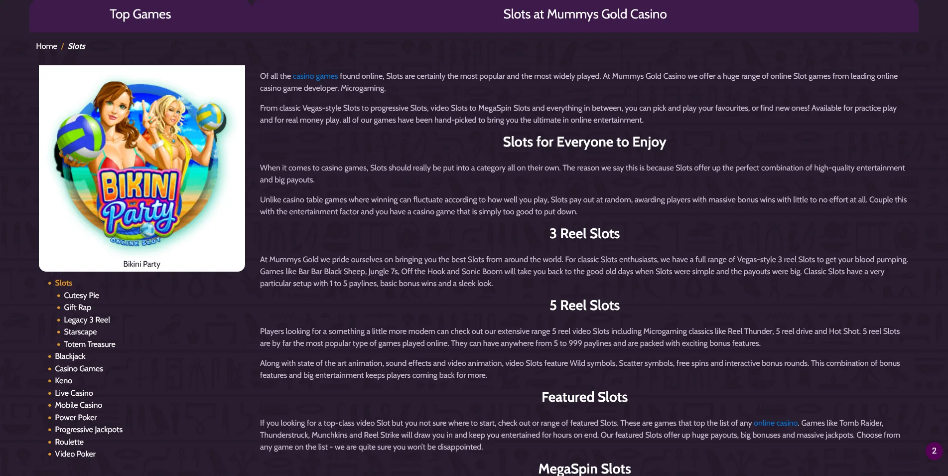 Mummys Gold casino layout causes mixed feelings. It looks quite modern but with outdated navigation. Everything is reserved in dark violet colors, with green call-to-action buttons to sign up or find more games to play.