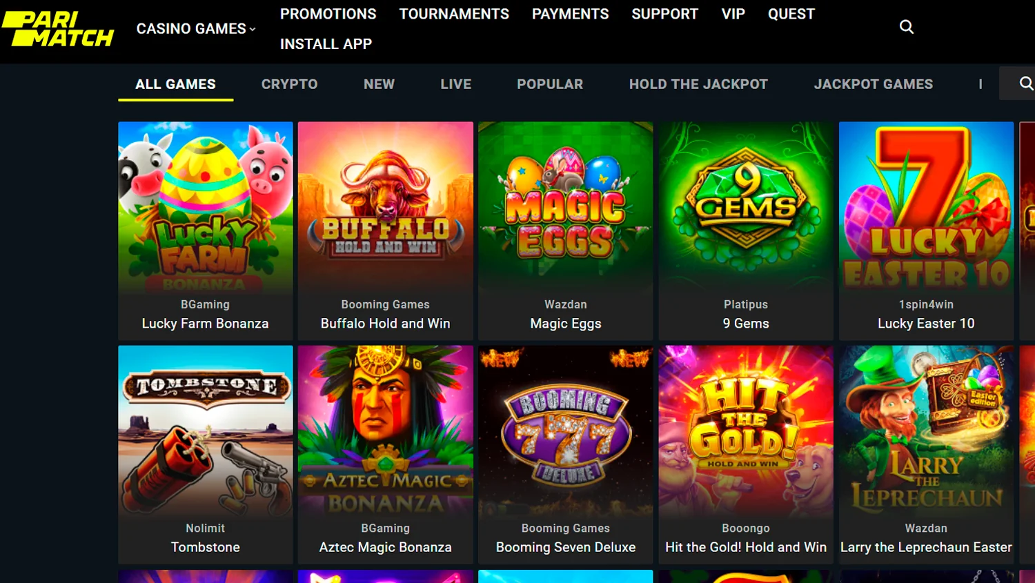 Parimatch Casino presents more than 1800 games separated into the following categories – Crypto, New, Live, Popular, Hold the Jackpot, Jackpot Games, Roulette, Card Games, Slots, We Recommend, Poker Games, Wheel of Fortune, Video Poker, Casual, Lottery, Craps, Live Cashback, Live Welcome Bonus, Live Tournament, Bonus Play.