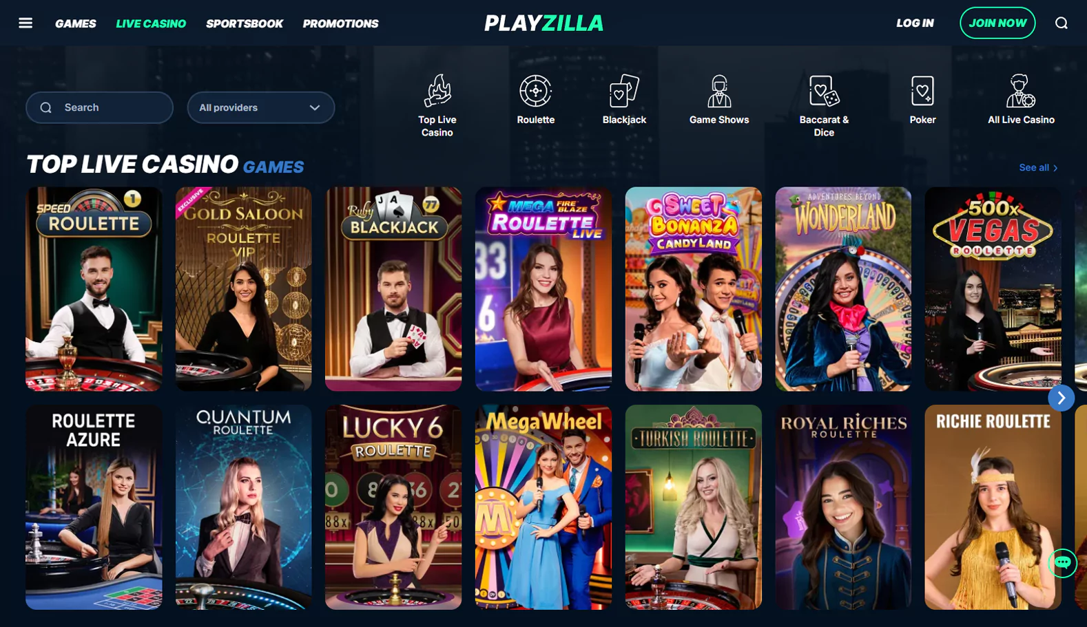 Among other games, Playzilla also offers a live casino where the games are hosted by real live presenters, allowing players to experience the casino from anywhere in the world. The collection of live games is more extensive with over 250 different live games. Among them, you will find baccarat, roulette, blackjack, poker, and many other classic and modern games with live dealers who are professionals in their field and will be able to help you with advice if needed. We have researched the range of live games and compiled a top of the best games and providers: