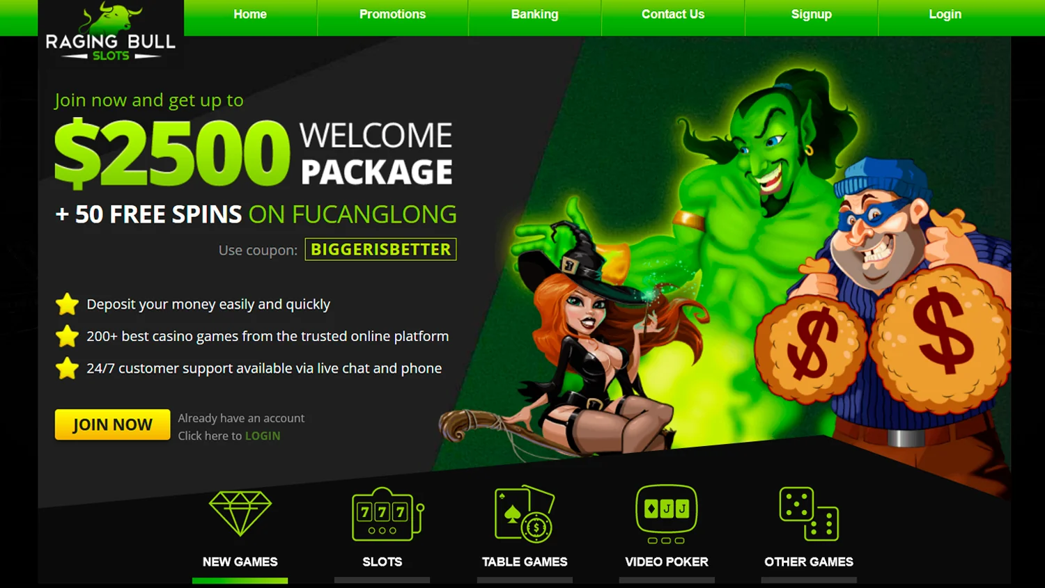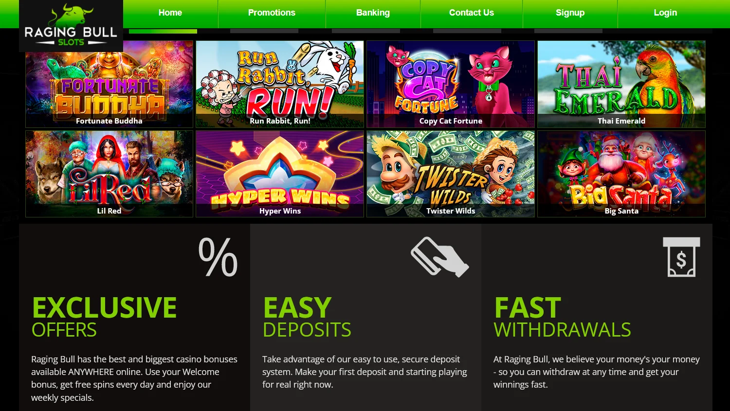 The RagingBull casino Aus is done in bright green and black, with an emphasis on green. The logo is a large green bull prepared to rush into battle. You’ll hardly experience any problems navigating through the sections. The UI is quite convenient, and with the capital font, you’ll quickly find what you’re looking for. The site header contains the following sections: