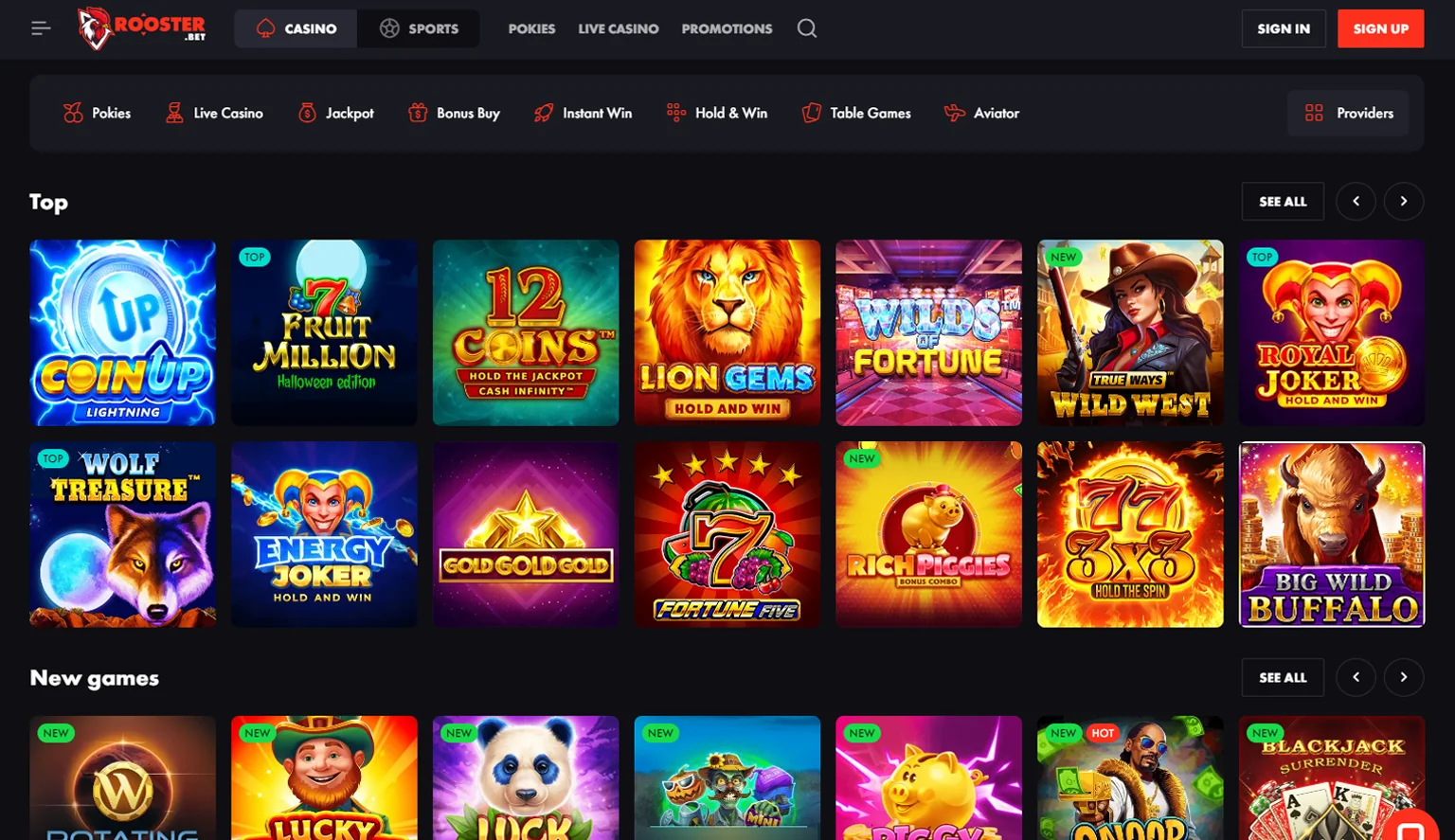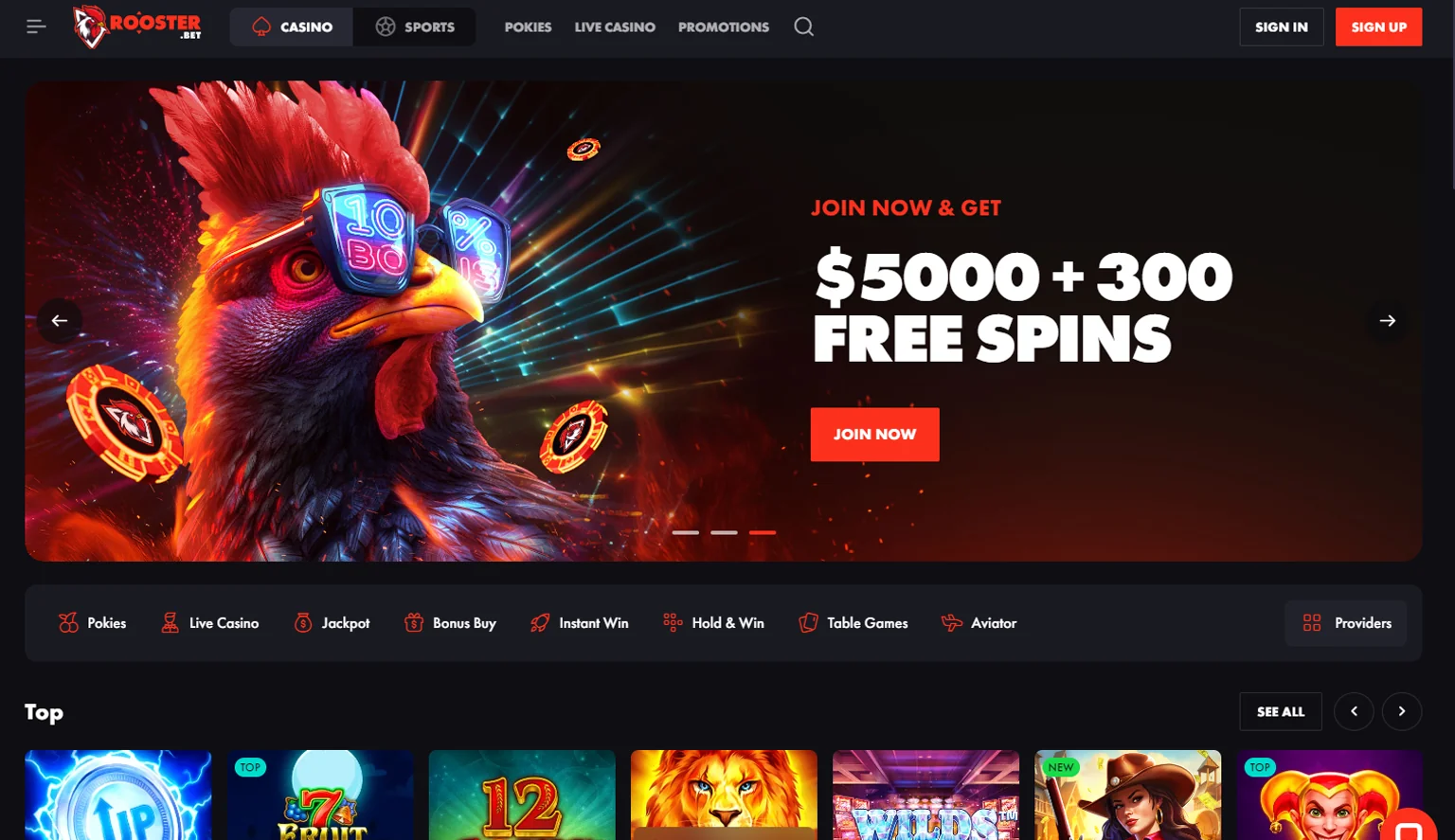 At the heart of the homepage, Rooster Bet Casino features a striking banner that highlights its latest promotions. Just beneath the banner, a well-organised horizontal bar showcases popular game categories: