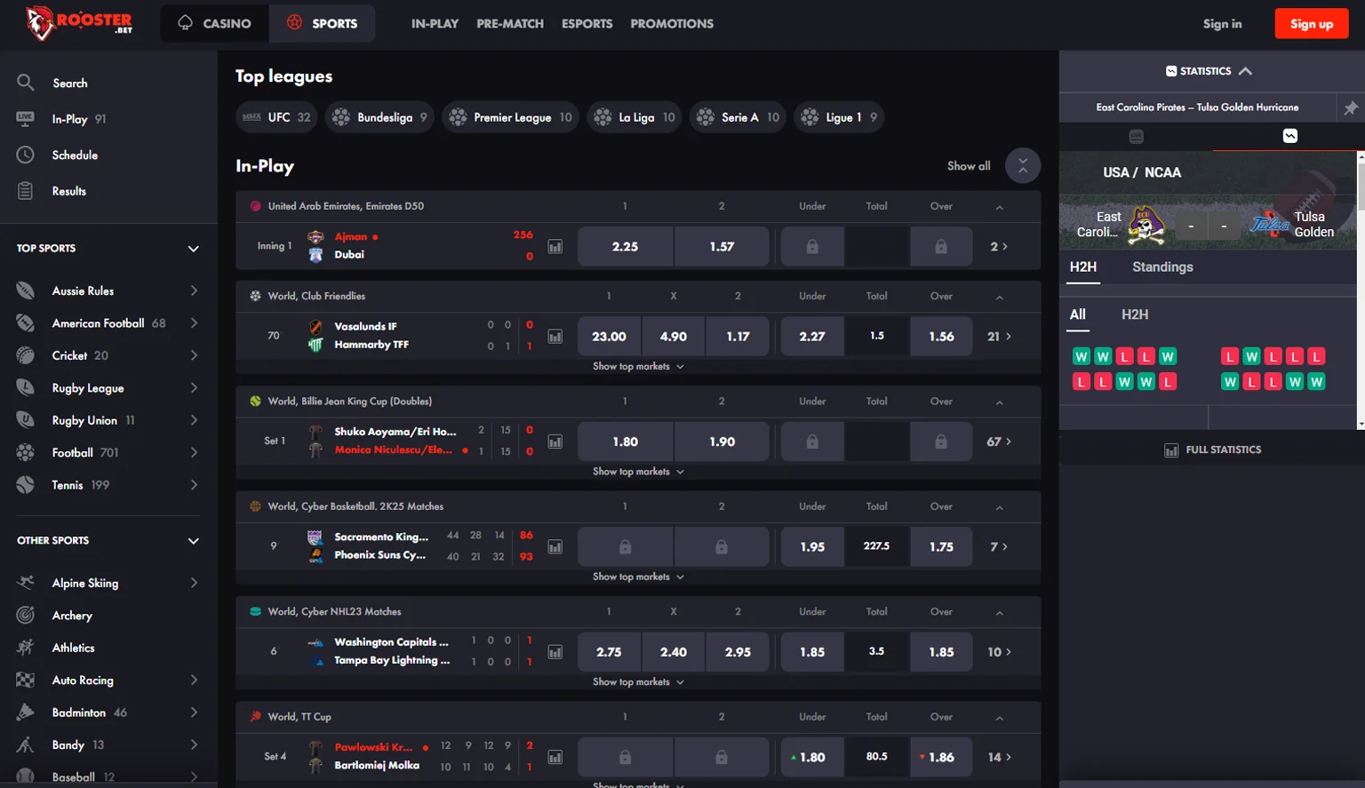 Rooster Bet boasts a trendy and enticing design, characterised by a colour palette of rich reds and intense blacks, creating a lively yet sophisticated aesthetic. This colour scheme is enhanced by gold accents, infusing a sense of luxury into the overall design, creating a visually appealing experience that remains user-friendly.