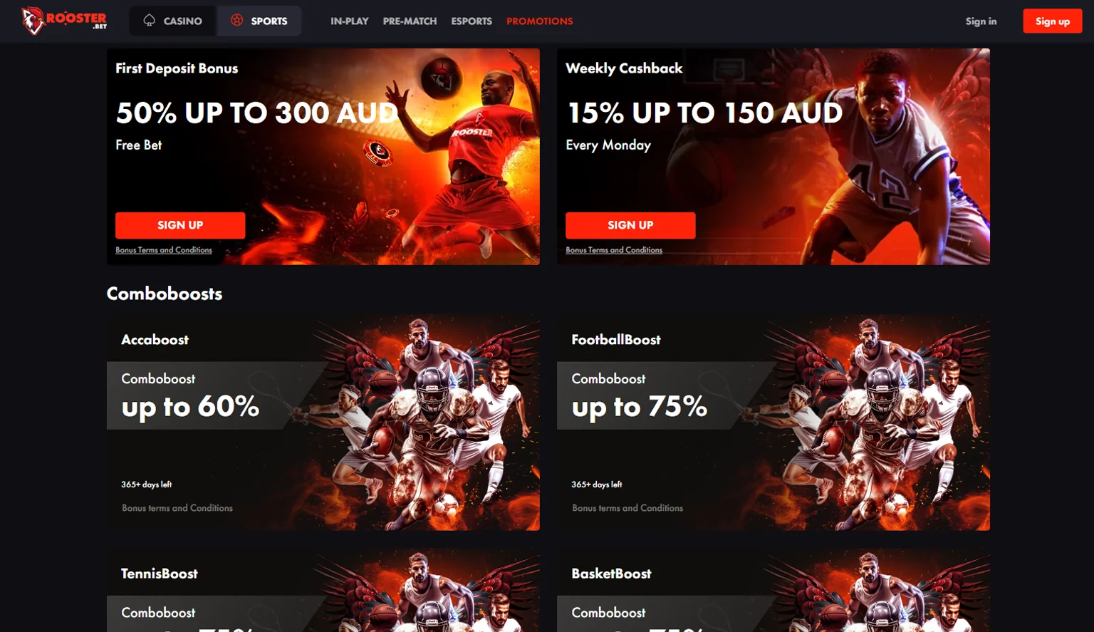 When analysing the promo section at Rooster Bet, we came across several bonuses that offer miscellaneous prizes. Besides the welcome bonus for new players, there are a couple of reload promotions for existing Aussie gamblers.