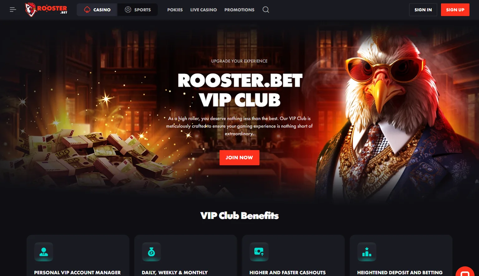At the top left corner of the page, you’ll find the Rooster Bet Casino logo—a stylised rooster symbol, embodying the essence of the brand’s name, and is crafted in vibrant colours that capture attention against the backdrop.