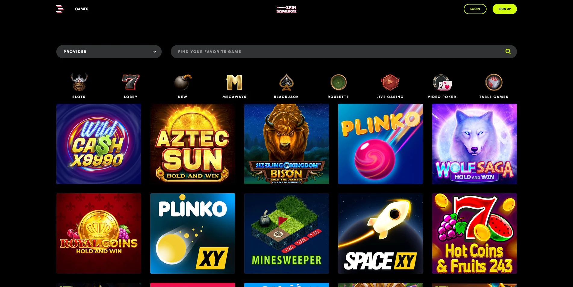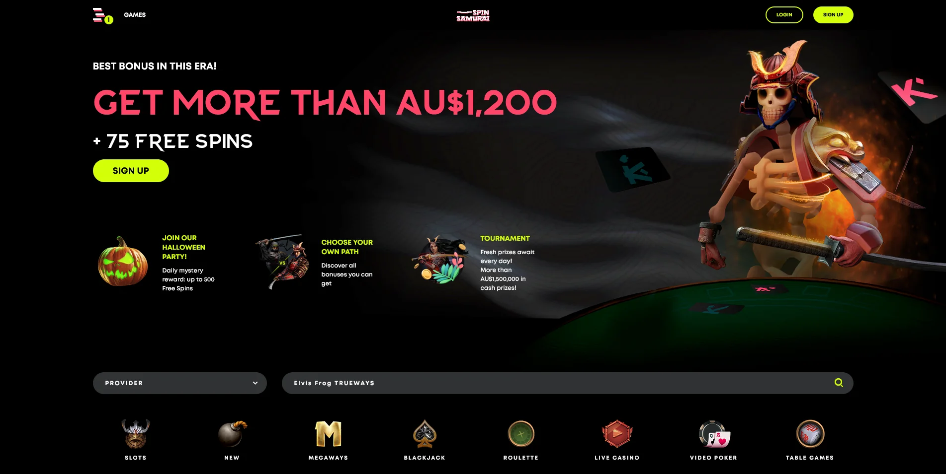 On top of the main page, below the menu bars, there will be a unique image of a Samurai. Together with him, you can find the most important info on the welcome bonus as well as the Sign-Up button. The bottom of this section features important details about the site, including the gaming content of over 3,000 casino games, the tournaments, and the available bonuses.