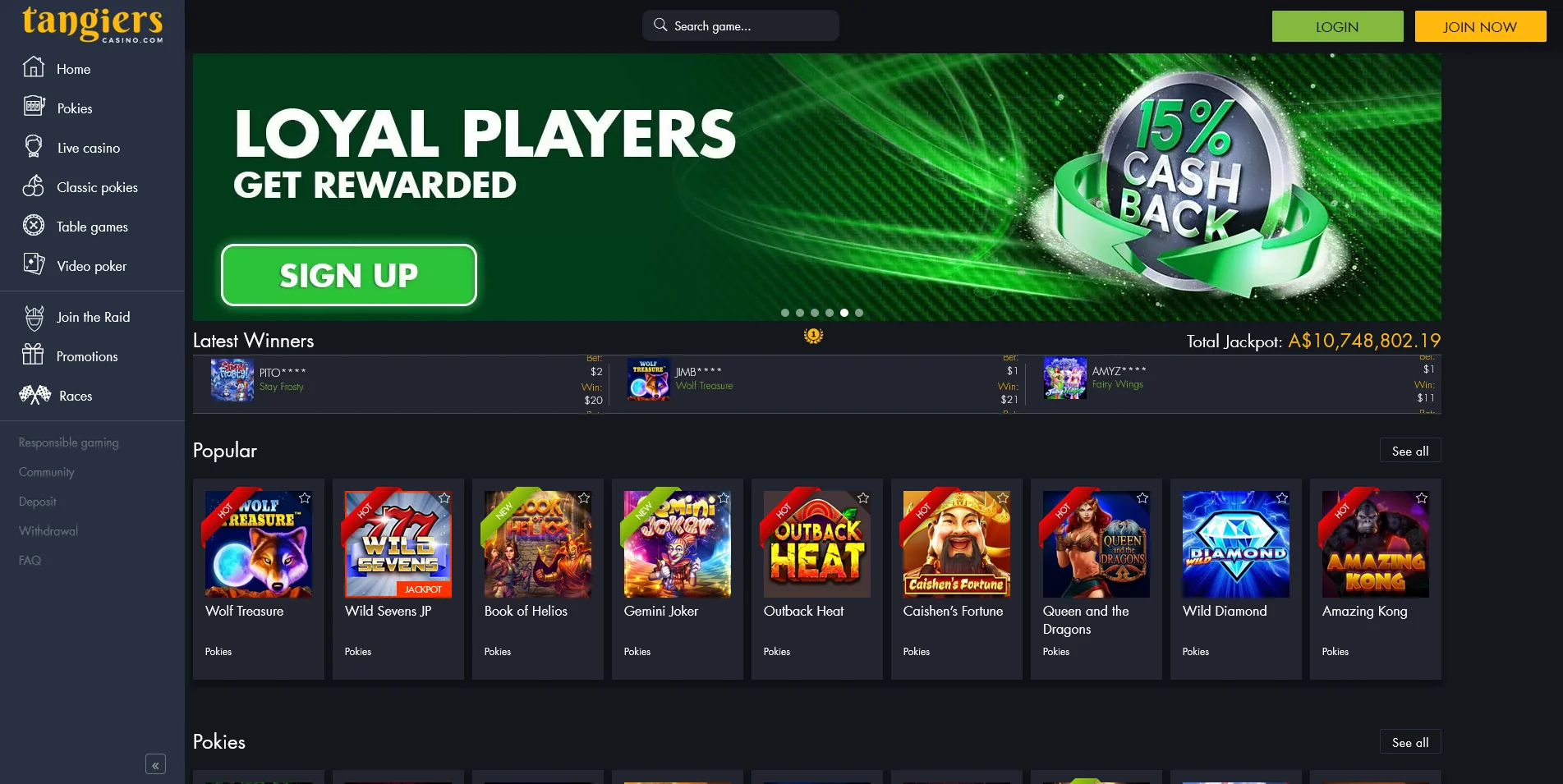 The central part of the page is initiated with a colourful banner that scrolls through the most popular bonus offer active at Tangiers now. Under the banner, there is a list of Latest Winners and the Total Jackpot accumulated on the site.