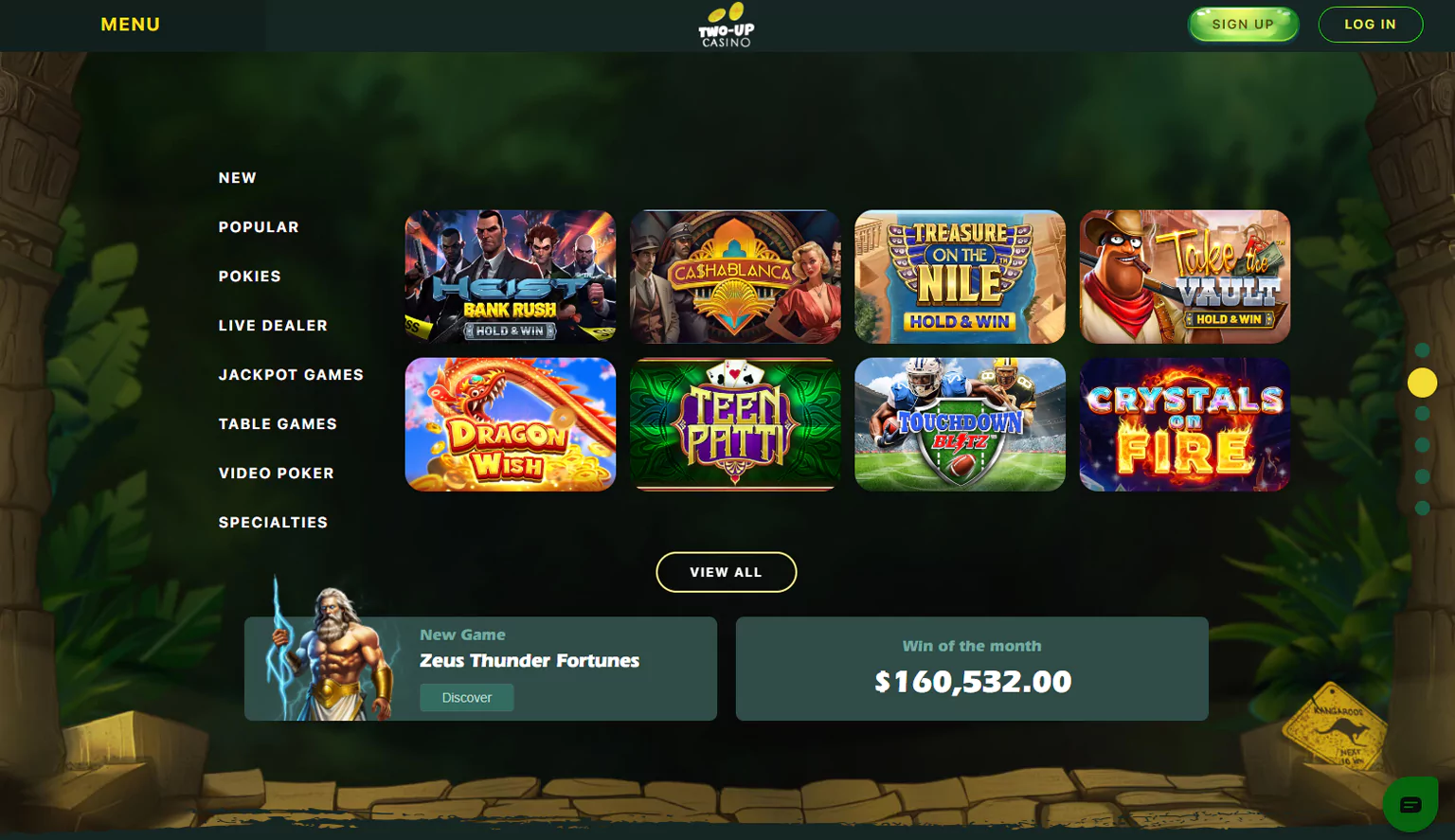 If you scroll further down the page, you can view info on the top new game and win of the month, a scrollable list of active promotions, advice compatibility info, as well as the advantages of playing at Two Up Casino Australia.