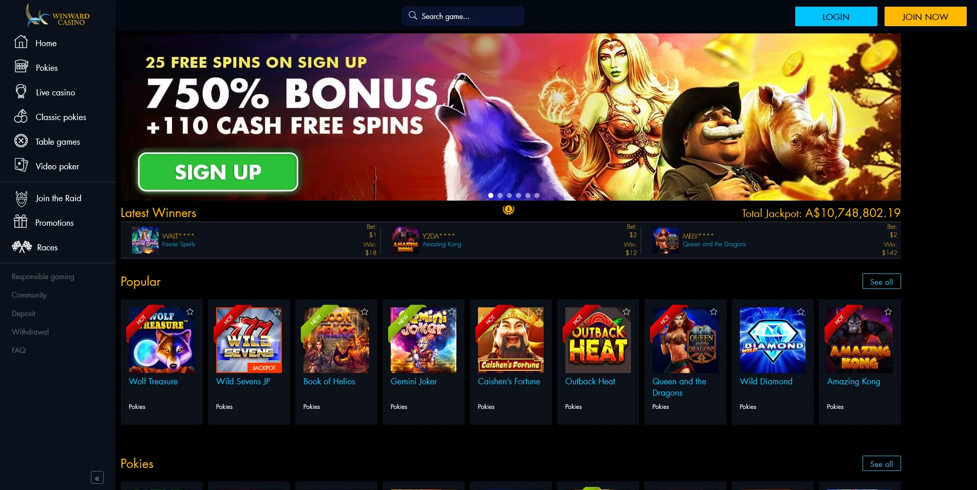The main promo banner is placed right in the middle of the page. Here, the hottest promotions and prizes are displayed, and immediately below is the info bar which notifies players about the Latest Winners, and the current Total Jackpot at Winward online casino.